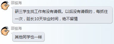 二、欺凌學(xué)生?;卮鹫哒f:邵振海2009年開始招收研究生,隨后要求他的學(xué)生都要讀博,給他做廉價勞動力。2010年招收的學(xué)生又被要求讀博,不愿讀博的學(xué)生在讀研生涯中被百般刁難。每年畢業(yè)的學(xué)生都要求給他干活到學(xué)校讓離校的最后一天,并且必須天天到實驗室報到。三、威脅學(xué)生。經(jīng)常威脅學(xué)生不能畢業(yè),要開除學(xué)生,不準學(xué)生找工作,找工作請假根本不批。學(xué)生都是敢怒不敢言。有骨氣有辦法的學(xué)生都換導(dǎo)師了。
