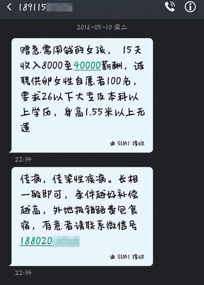 • 2016年05月15日 01:55 來源:新京報 原標題:“求卵”短信群發(fā)大學生稱15天掙4萬