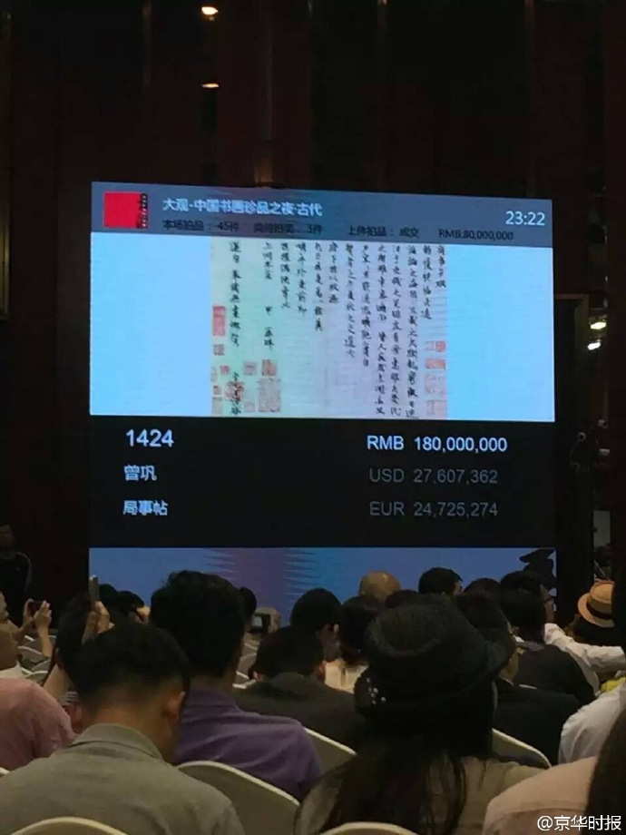 • 2016年05月16日 05:31 來源:京華時報 @京華時報:【曾鞏傳世“124字”墨跡賣出2.07億元】15日晚,曾鞏傳世孤本《局事帖》在中國嘉德“大觀夜場”以一億三千萬元起拍,經(jīng)多倫競價,最終以1.8億元落槌,加傭金2.07億成交。據(jù)了解,《局事帖》是迄今發(fā)現(xiàn)的唯一一件“唐宋八大家之一”曾鞏的傳世墨跡,為曾鞏62歲那年寫給同鄉(xiāng)故人的一封信,共124字,距今已有936年,曾被歷史上多位名人收藏,并經(jīng)徐邦達考證著錄于《古書畫過眼要錄:津隋唐五代宋書法》。7年前,這件作品以1.0864億元成交,成為第一件過億的中國書法。京華記者 易小燕