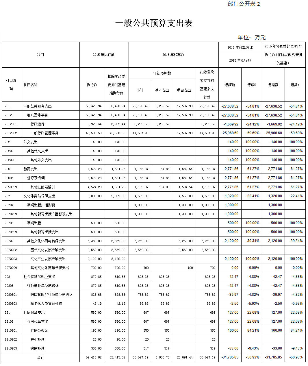 • 2016年05月01日 18:51 ?來源:鳳凰資訊 ?共青團(tuán)中央近日在官方網(wǎng)站公布了2016年部門預(yù)算,其中2016年一般公共預(yù)算當(dāng)年財(cái)政撥款30627.17萬元,比2015年執(zhí)行數(shù)62413.02萬減少31785.85萬元,減少幅度50.93%。